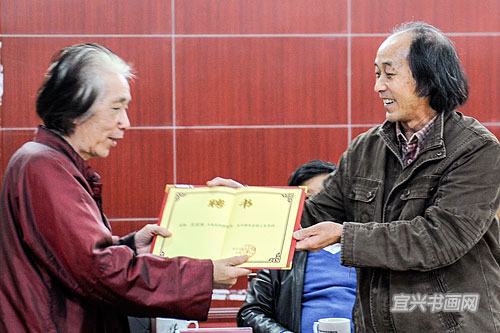 高研班老学员、重庆大学艺术学院中国画系主任熊显林代表重庆大学艺术学院,向吴冠南颁发特聘教授、硕士生导师聘书 (朱晓强/摄) |