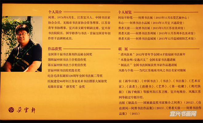 何勇,1974年生,江苏宜兴人,中国书法家协会会员,无锡市书法家协会理事,江苏省青年书法家协会理事,宜兴市文联专职副主席,宜兴市书法院院长。何勇从小对书法和文学结下了不解之缘,少年时读三国,背唐诗,勤奋习书,苦练颜勤礼碑,心摹手追于古人的法帖之中,在传统的经典里汲取精华。何勇是一个懂得取舍的人,其书法风格虽然孳乳于米芾,但他按照自己的理解来演绎米芾,减弱了米芾爽捷、猛厉的刷笔特点,米芾在何勇笔下变得更从容和优美,加之何勇在书写时丰富的章法变化,使他的书写在他这代人中显得既具有深厚的传统根基,同时又富于变化。其小字精到且不失大气,堪称奔放奇肆、雄厚圆融;大字则遒劲简约而随意自然,雍容华贵而富于书卷气。何勇始终坚守着传统文化的精魂,不盲目跟风,不追逐时流,简静居怀,淡于荣利,以一颗率真质朴的本心,沿着自己的道路不激不励、信步前行。“退笔如山未足珍,读书万卷始通神”,临池之外,他还不断强化自己的“字外功”,以其博学而不断拓宽自已的文化视野。2014年,他参加中国书协国学班的学习,用国学来充实书法的内蕴。这一切,使得他的书法自然随性,才情纵横,独具个人风貌,在众多的新生代书家中脱颖而出。 |