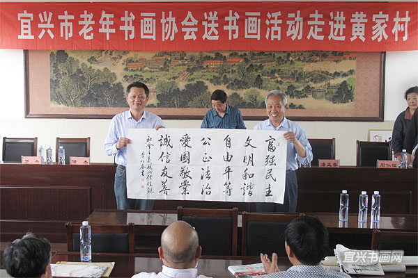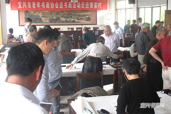 宜兴市老年书画协会送书画活动走进黄家村5月25日,宜兴市老年书画协会一行25人,由常务副会长兼秘书长马皓带队,赴杨巷镇黄家村举行送书画活动。活动受到镇党委和村委会的热烈欢迎。杨巷镇宣传委员罗杰主持活动,黄家村党支部书记罗志平介绍本村情况,杨巷镇党委副书记史伟平致贺词,协会副会长马皓讲话。协会7个分会的代表向黄家村赠送书画作品26幅,并参观了该村的活动室。在现场书画笔会上,16名协会会员泼墨挥毫,又创作了28幅作品赠送给村委。本次活动是协会以书画服务社会,传递社会正能量,为农村文化建设绵上添花。(岳桂林摄影报道) |