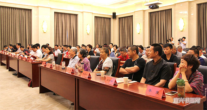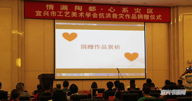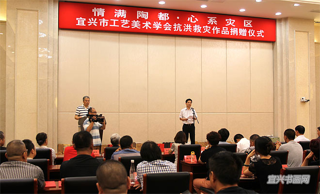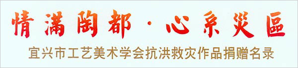 8月3日,由市工艺美术学会、市紫砂艺术研究院组织的“情满陶都·心系灾区——宜兴市工艺美术学会抗洪救灾作品捐赠仪式”在市政府会议中心举行。市委副书记周中平,市人大副主任赵菊明,市政协副主席莫克明,市科协主席徐群芳,市文联主席魏敏,市民政局副局长汤惠仙,市科协副主席马国华,市工艺美术学会理事长卫江安、副理事长兼秘书长尹祥明、副理事长裴俊、启明,中国工艺美术大师李昌鸿,中国陶瓷艺术大师邱玉林、张红华,江苏省工艺美术大师沈遽华、张海平,江苏省陶瓷艺术大师吴扣华、李霓,研究员级高级工艺美术师李群等共80余人与会。 |