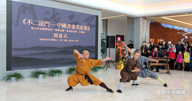 开幕式上,有市图书馆的评弹表演,展览方的少林功夫和古琴表演,释延达法师作开幕致辞 |