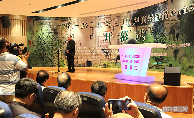 8月8上午,“一带一路”人类文明——卢禹舜作品展在宜兴市美术馆开幕。展览由由中国国家博物馆、中国美术家协会、环球人物杂志、中国国家画院、中央数字电视书画频道、宜兴市文广新局、宜兴市文联主办,宜兴市文化中心管理有限公司、宜兴市美术馆、北京八荒锦绣文化发展有限公司、黑龙江八荒通神文化发展有限公司、黑龙江禹舜文化艺术研究院、禹舜美术馆、桂林八荒锦绣美术馆承办、宜兴书画院、江苏紫泥公社文化创意有限公司协办。 |