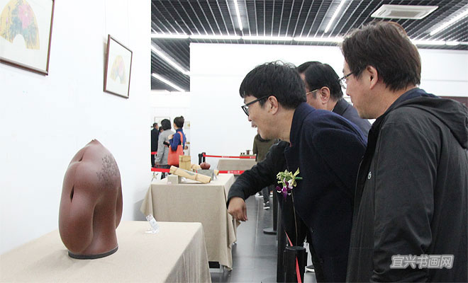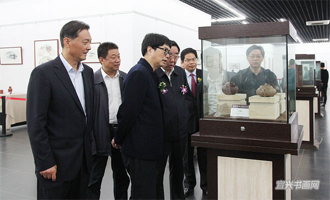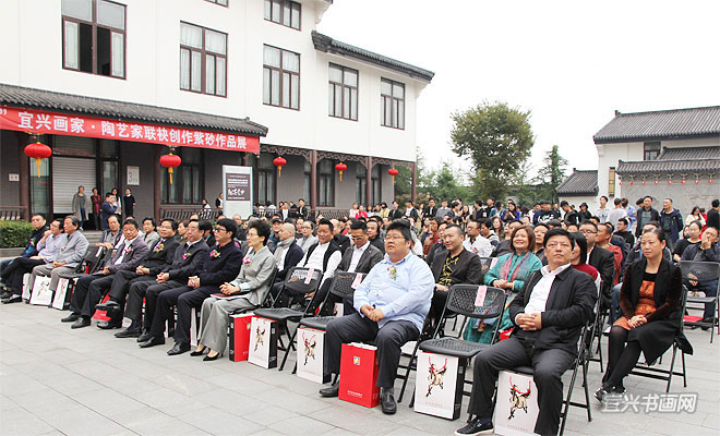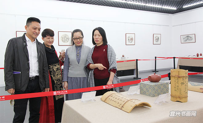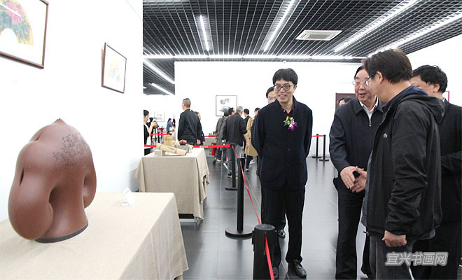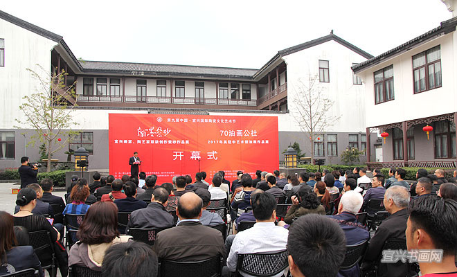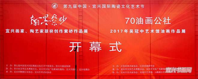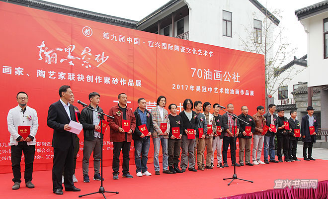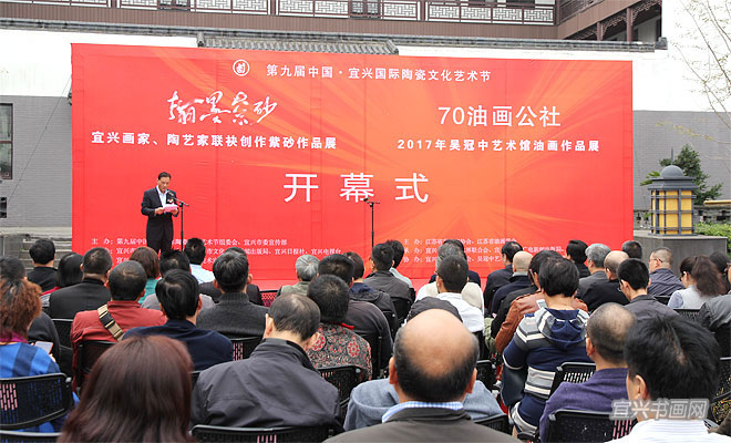 在庆祝党的十九大胜利闭幕,并迎来第九届中国宜兴陶瓷文化艺术节隆重举行之际,10月26日下午,由宜兴陶瓷文化艺术节组委会、宜兴市委宣传部主办的“翰墨紫砂——宜兴画家陶艺家联袂创作紫砂作品展”以及“70油画公社2017年吴冠中艺术馆油画作品展”,同时在吴冠中艺术馆开幕。省人大副主任、省工商联主席许仲梓,省人大教科文卫委主任、省文联主席章剑华,中央美院中国画院副院长姚鸣京,市政协主席梅中华,市委常委、宣传部部长沈晓红,市人大副主任赵菊明,宜兴日报社社长程伟,市文广新局局长许夕华,市文联副主席何勇、史小明,市美术馆馆长刘明,无锡市美协副主席吴俊达,中国书协理事张六弢,市美协主席、吴冠中艺术馆馆长承强出席开幕式。市文联主席魏敏主持仪式。 |