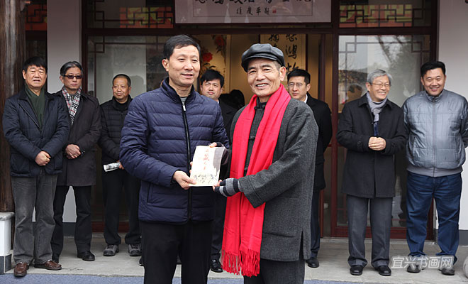梅南频向悲鸿故里书画院捐赠作品,悲鸿故里书画院院长张雁伟向梅南频颁发收藏证书 |