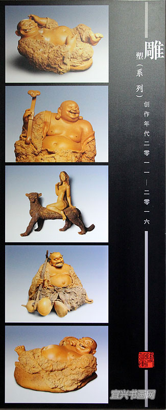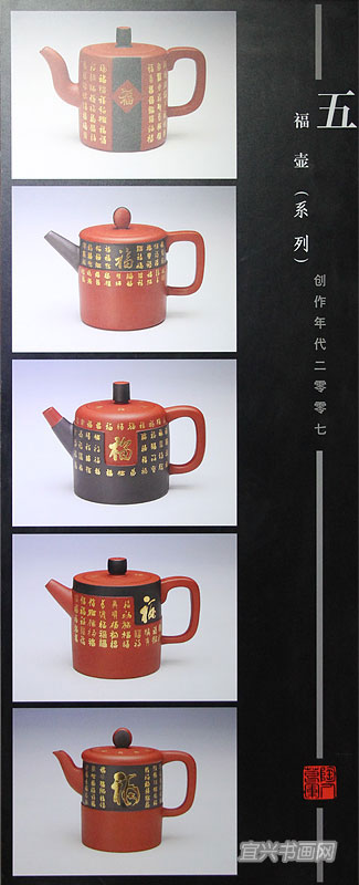 竹林七贤 行者系列 传统、民族、时代、个性,葛军的紫砂作品,始终离不开这核心的四个词语。创新是一个民族的灵魂,也是艺术的发展之源,更是葛军前进的不竭动力,葛军喜欢在能拼的时候,尽量不留遗憾:从他发明“色饰法”到《金钱豹》的诞生;从《将军壶》的打造到《贺岁壶》的创意,葛军从来都是既不重复别人,也不重复自己。用他自己的话说:“最好的作品永远是下一件。”他对作品个性风格的追求,相当于对作品设计专利的保护一样重视,他喜欢用现代的艺术手法去演绎当下的紫砂。在他眼里,永远没有最满意的作品,但人们一看就知道是他制作的壶,他就感到比较满意了。可以说,他的每一件作品,都渗透着他自己丰富的情感,独特的个性,鲜明的色彩以及文化的元素。人们对他的壶作远瞧近观,一眼就会判定:“这是葛军的壶。”因此,他的壶在艺术上体现的是个性特征的充分张扬,在市场上遵守的是竞争规则的充分认可。他设计制作的紫砂壶,超越物体表象而去关注其精神,追寻精神世界中的规律与变化,从而达到精神与想象的统一,用现代的手法赋予传统的紫砂自成一派的魅力风格。尤其是葛军一直潜心于紫砂的科研、开发、设计,独创“色饰法”的装饰技法,使紫砂艺术实现了由传统走向现代的突破,将古老的紫砂壶演绎为变化多端、和谐统一的境界。一组用色饰法创作的“四季如春”系类,体现出对人与自然的尊重,同时又为繁忙的现代都市人打造出一片灵魂的栖息之地。 |