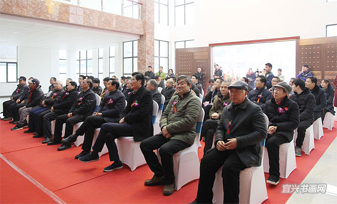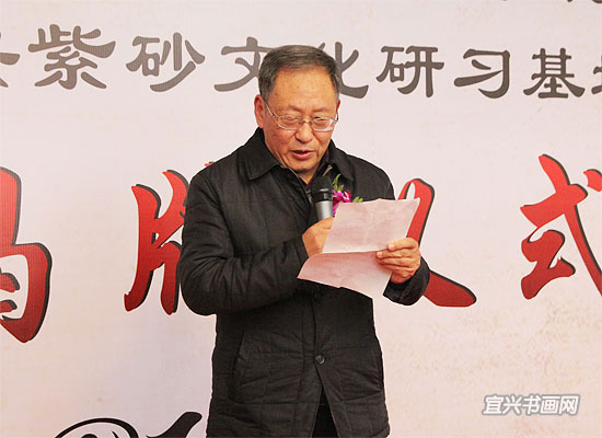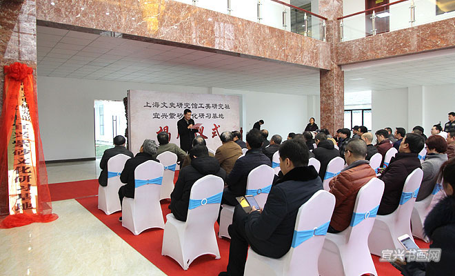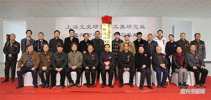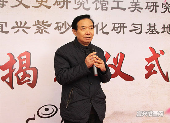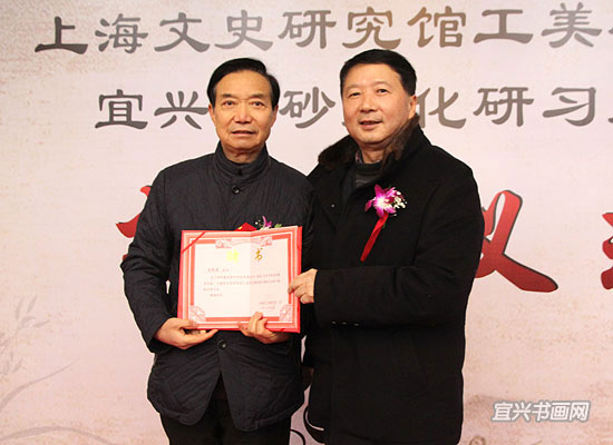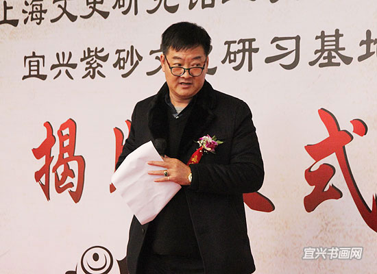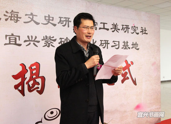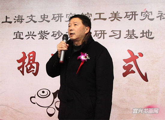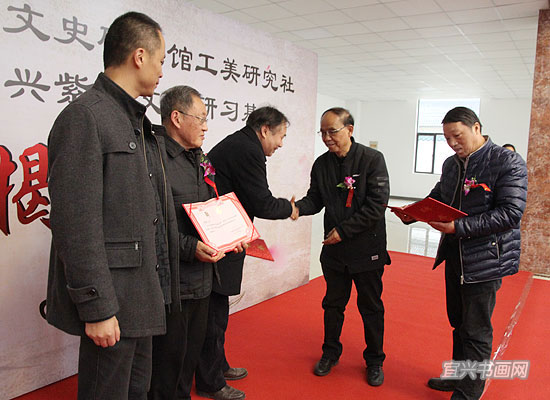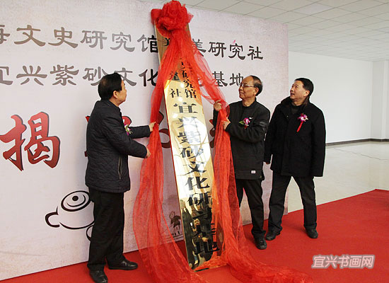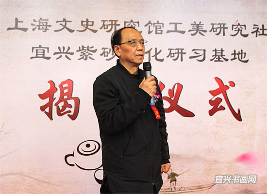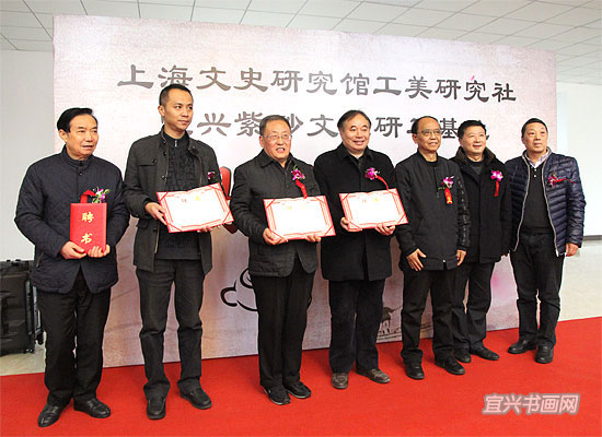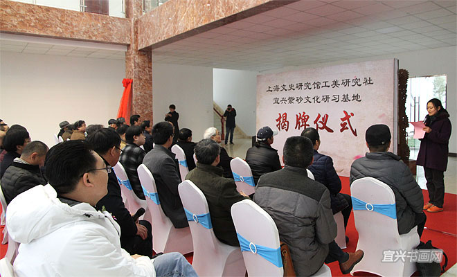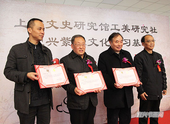 1月20日下午,上海市文史研究馆工美研究社宜兴紫砂文化研习基地揭牌仪式在宜兴市荆溪紫砂艺术院(杭中吉艺术馆)举行。上海市文史研究馆馆长郝铁川、上海市文史研究馆工美研究社社长萧海春、上海市文史研究馆工美研究社秘书长秦明章,为宜兴市陶瓷行业协会会长史俊棠颁发紫砂文化研习基地名誉主任聘书,为中国陶瓷艺术大师毛国强,宜兴市书画院执行院长、宜兴市山水画协会会长杭中吉,荆溪紫砂艺术院常务副院长、杭中吉艺术馆副馆长杭杰(杭利强)颁发上海市文史研究馆工美研究社特聘研究员聘书。郝铁川、萧海春、史俊棠、毛国强、上海市文史研究馆工美研究社副秘书长王东升、宜兴市文广新局副局长杭科军在揭牌仪式上讲话。