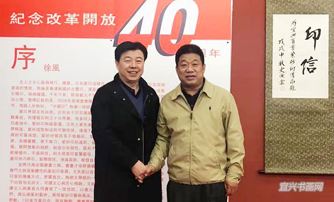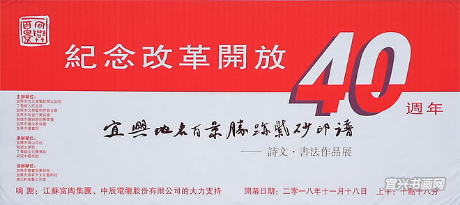 展 讯纪 念 改 革 开 放 40 周 年宜兴地名百景胜迹诗文书法紫砂印 主办单位:宜兴市文化广电新闻出版局、丁蜀镇人民政府、宜兴市文学艺术界联合会、宜兴市陶瓷行业协会、无锡市书协篆刻专委会、宜兴市书法家协会、宜兴书画院 开幕时间:2018年11月18日上午10:18