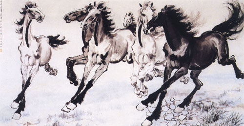 徐悲鸿来源:《近现代名家书画品鉴》 邓明 著 上海科学技术出版社 徐悲鸿(1895一1953年),江苏宜兴屺亭桥人。父达章公善画,幼即从父临吴友如界画人物。家贫,二十岁赴沪谋生,结识高奇峰,得康有为授书法之诀,入震旦大学习画。1917年留学日本,归后应聘北京大学画法研究会导师,1919年公派赴法朱利安学院留学,考入巴黎美术学校,师事达仰和弗拉盂,考察德、比、意国美术。1927年归国,任教中央大学艺术系。1933年携中国近现代绘画赴法、德、比、意、英及苏联展览,广获好评。抗日战争开始后,随中大西迁重庆,多次出国举行个展,将卖画收入全部捐给国家以助抗战。尝游印度,与诗人泰戈尔缔交。1944年任中国美术学院院长,1946年任北平艺专校长,1950年任中央美术学院院长、中华全国美术工作者协会主席。1953年9月26日因病逝于北京,生平杰作及所藏中外名迹悉数捐献国家,珍藏于徐悲鸿纪念馆。一生从事美术教育,求贤若渴,傅抱石、叶浅予、庞熏琴、齐白石、张大千、陈师曾皆与之合作,奠定以写实力基础的现代美术教育体系。爱才如命,桃李天下,一代大家如吴作人等皆出其门下。著述颇多,有《徐悲鸿艺术文集》传世。