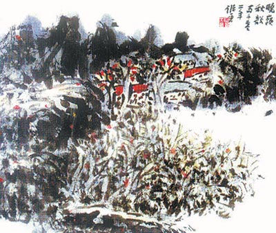 储云年轻时即十分推崇黄宾虹的画,他学好书法后,再学黄宾虹的画,就更地道了。黄宾虹的画不用大笔泼墨,也不大片涂色,全用点线组成,即全是书法线条,古人论用笔“须笔笔转去”、“尽余之线,不作半寸之直”,黄宾虹的画即笔笔转去,不是完全没有直线,一是以曲线为主,二是即使是直线,用意则不直,外直而内曲,变化多端,内蕴无穷,全是传统书法的功力。因此,如前所述,你没有黄宾虹书法的功底,硬学其画,外形似似,而内在无一似。这是功力问题。储云书法有功力,作画亦然。他作山水画,不用大片泼墨,那样外状雄强,而内涵实简单而空;也不大片涂抹色块,那样缺少变化。他以线条为主,点辅次,中锋用笔,浑圆而多变化,莽而见层次,笔笔写出,潇洒而含蓄,且多耐人寻味。