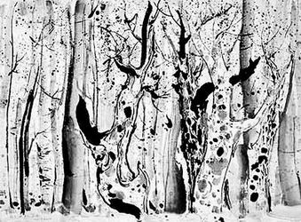 龙潭湖边,隔着时空回顾自己逝去的岁月,算来已入垂暮之年,犹如路边那些高大的杨树,树皮干裂皱折,布满杂乱的疮疤和乌黑的洞。布满杂乱的疮疤和乌黑的洞的老树面对着微红的高空,那是春天的微红,微红的天空上飞满各色鲜艳的风筝,老树年年看惯了风筝的飞扬和跌落。我画老树的瘢痕和窟窿,黑白交错构成悲怆的画面,将飘摇的彩点风筝作为苍黑的树之脸的背景,题名《又见风筝》;又试将老树占领画幅正中,一边是晨,另一边是暮,想表现昼与夜,老树确乎见过不计其数的日日夜夜,但永远看不到昼夜的终结。