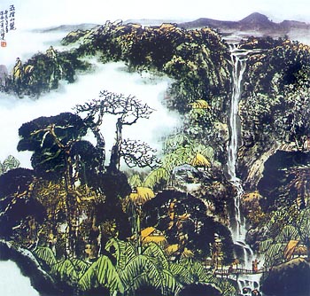 生活是艺术取之不竭的源泉。大自然是山水画家最好的老师,这是千真万确的真理。保文先生曾讲过“生活的美,大自然的魄力吸引着我,不断地给我创作上的灵感和意态”。丰富的生活不仅为他提供了艺术题材,而且也雕琢了作品创作的风格。海南风光题材系列,使人想到美丽温馨的祖国第二大宝岛,这和当前人们渴望的在大自然中寻找自己的精神伊甸园的梦想相契合。画家用深厚的笔墨技巧,把海南风光刻画得生动传神,十分富有情趣。水面波光粼粼,倒影掩映,清澈无瑕,溢光流彩。树木秀丽脱俗如水洗,远处山色瀑布空氵蒙,虚无缥缈。一切都笼罩在一片雨后空灵轻薄的氤氲中,秀润静谧。品读范先生的海南题材作品,我们仿佛已置身画中,信步领略宝岛的秀丽景色,画家用泼墨和泼彩并用,湿润而有情致,丛树用笔写出,干湿并用,流露出深厚老辣之气。山庄掩映于丛树、迷雾之中,引人遐想,画面云气茫茫,湿润而厚重。这些作品显示出画家精深的笔墨功夫和深厚的艺术修养。漓江风光系列题材画家将漓江明媚秀逸的景致表现得淋漓尽致,远处群山掩映在烟雾缭绕中,如诗如画,近处竹树生机盎然,枝桠虬劲,叶茂花艳,再点缀以明澈无瑕的漓江水,整个画面显得明媚绚烂,山川树木,格外壮观而灵秀,浓郁雅致。画中那白墙红瓦的房舍与绵延山势呈映之意境,又不乏点缀之趣。真是一个清新幽雅而令人如痴如醉的人间仙境。画家丰润、浑然一体的笔墨把漓江的山川江水表现得栩栩如生,一幅幅情韵神奇而优美动人的作品,显示出画家有容乃大的思想境界,这与他长期以来到真山真水中写生,练就一手硬功夫有很大关系。他到大自然中写生不是如实地记录生活,而是先立足形似,并在形似的基础上用夸张浪漫的手法去表现对象的神韵。他的作品能产生艺术魅力的原因也在于此。