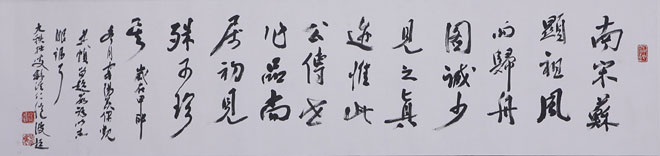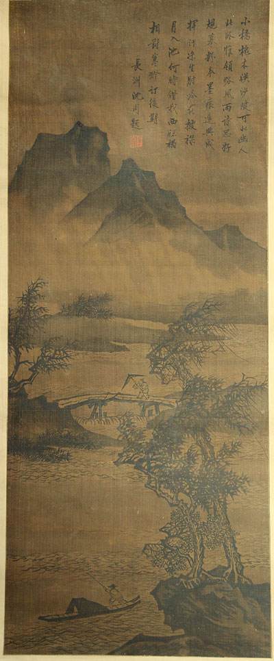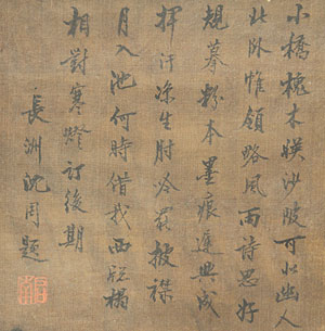 画面的右上方有明代大画家沈周题诗:“小橋槐木暎沙陂,可似幽人北卧帷。領略風雨诗思好,規摹粉本墨痕遲。興成揮汗凉生肘,吟罷披襟月入池。何時借我西牕榻,相對寒燈订後期。”署款“長洲沈周题”(图21)。诗中道出画面所表达的江南水乡意境之美,同时又揭示风雨归舟之隐喻情思,并抒发面对前人佳作赏心悦目和意欲追摹取习的感慨。“北卧帷”、“西窗榻”乃本诗“诗眼”。“北卧帷”典出中医学人体睡眠从南朝北为佳,诗中暗指失中原半壁之恨;“西窗榻”典出唐王勃、徐孺下陈蕃之榻之句,暗指北宋之高士宁为渔夫的气节。沈周(1427~1509)是明代中叶吴门画派的开创人物,精鉴赏、且善诗能文。现在我们要解读一首前人为古人画所题的诗,先要回归前人的角度来评析古画的意境与寓意及时代背景,并考虑题诗者当时的地位及阅历,这样就不易偏离诗意,否则就会千人解读千人意了。沈周面对这样一幅南宋宫廷画家的画幅,定然思绪万千:痛失半壁江山后的南宋,北方乌云蔽天,风雨如磐,而画面行者顶风冒雨和梢公竭力破浪前行的情态,不正是体现了一种冲破险恶环境,奋发前进的抗争精神么?沈周后期的作品里,时常出现顶风前行的人物形象,可看到沈周对此画确实颇有感触并加以借鉴吸收的后效。此外,大家皆知七律诗有较严格的格律,此诗末联看似不合平仄规矩,但沈周题诗乃文人作派,有很大的随意性,此诗是沈周触“画”生情,有感而发!且古人吟诗作对是按古音的,甚至有以方言出联创作,而沈周系苏州籍贯,当时盛行吴语,当用今音朗读古联时,容易误会古人平仄不合格律,而且自古平仄失调,平仄和不拘平仄之争是永恒的话题,所以,若以现代普通话的标准来论断此联实是不妥。再有, “何时再借西窗榻,相对寒灯细品茶”为故宫旧藏清王翚《秋树昏鸦图》题明代唐寅诗,虽为绝句,末尾却大有同工之妙!可证明代中叶吴派确实有此作诗风格。 |