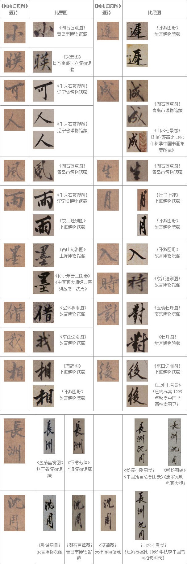 22. 本图沈周题诗与其它相近文字比照表 沈周题诗的书体是他从早期学习明初台阁体转向取法黄庭坚楷行书体的时期书风。字体偏于瘦长,结体紧结内敛、 锋颖劲锐,起笔、转笔、收笔都较为劲利,而他晚年书体用笔较为浑厚、凝重,故对照推断此题诗应是他六十岁前后所书。题诗中的书法与他相近时期诸多作品中的相比较,可探见无论结体、用笔的习性都有许多共同处。现拣出一部分相近文字进行比照(见附图22),可证此题诗应出于沈周手笔无疑,善鉴者可一目了然。 |