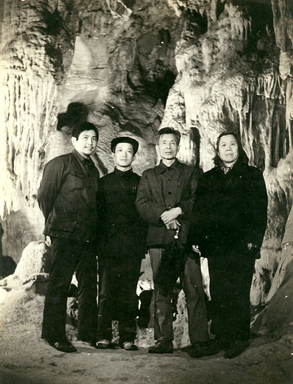 1983年吴俊达(左)陪同吴冠中先生(中右)及夫人(右)游览宜兴善卷洞合影