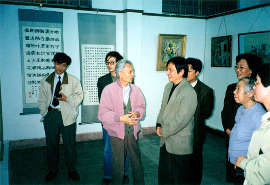1997年吴冠中先生回故乡参观书画展览,与吴俊达亲切交谈