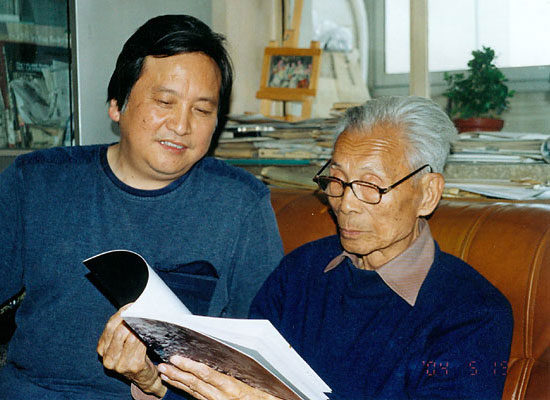 2004年吴冠中先生在寓所看吴俊达画册时合影