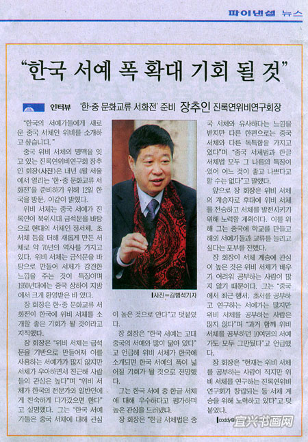 韩国《经济日报》2010年12月13日专访文章《“蒋秋吟书法展”将成为韩国书法扩展的机会》 |
