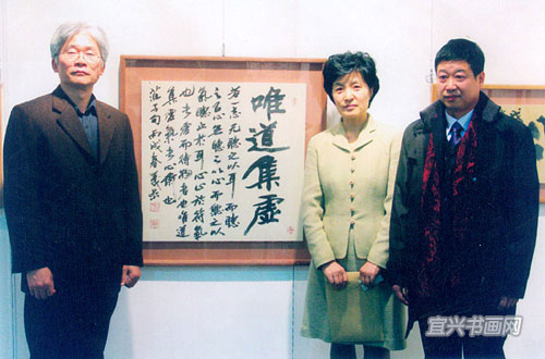 蒋秋吟与韩国书法家李容淑(右二)等人士进行书法艺术交流。韩国书法界人士称陈禄渊魏体书法是“中国另类书法”。 |