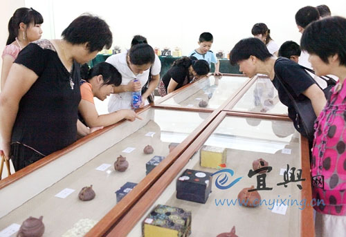 陶艺捐赠作品展亮相美术馆宜兴日报2009年7月27日报道:7月26日,为期五天的市陶瓷艺人捐赠作品展在市美术馆开幕。这些作品由市陶瓷实训基地组织198位陶瓷艺人集中捐赠,每位陶瓷艺人捐赠一件自己近年创作的代表作,在展示自己才艺的同时,也丰富了市美术馆的馆藏。图为市民欣赏捐赠作品。 (丁焕新 摄)